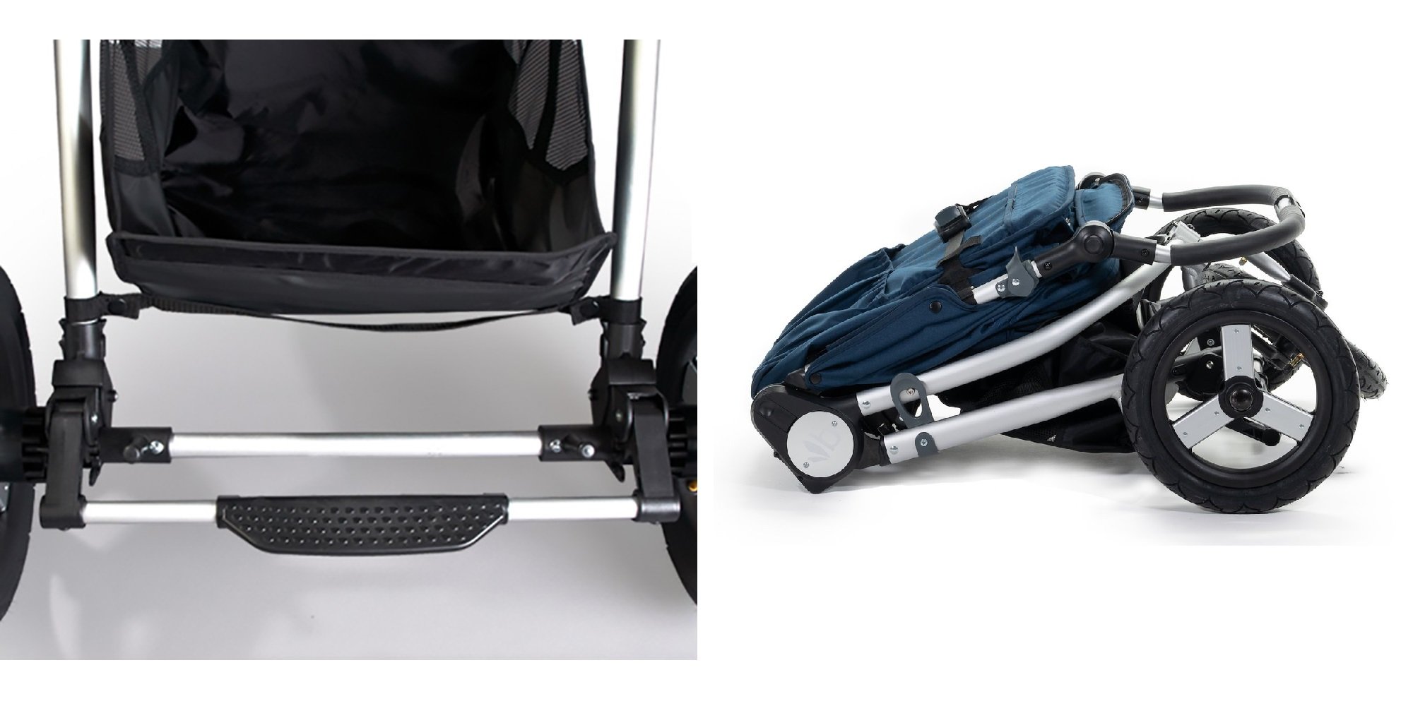 Устойчивость коляски Bumbleride Indie обеспечивается за счет грамотно просчитанной конструкции. Рама изготовлена из анодированного алюминия, компактно и легко складывается. Для еще большей компактности можно снять задние колеса. Основная нагрузка приходится на задние колеса, которые оборудованы амортизаторами и стояночным тормозом. Переднее поворотное колесо обеспечивает мобильность и имеет возможность фиксации. Несмотря на то, что коляска трехколесная, она довольно устойчивая за счет правильного центра тяжести. Ручка регулируется под любой рост, на ней также есть страховочный ремешок.