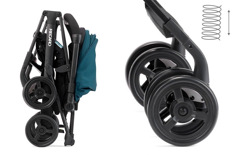 Механизм складывания Recaro Easylife Elite 2 очень простой и сложить коляску можно одной рукой. Коляска занимает мало места в сложенном виде, будь то в коридоре вашей квартиры или дома, или в багажнике автомобиля. Благодаря компактности коляску можно брать на борт самолета. Шасси коляски имеет пружинную амортизацию на все четыре колеса, поэтому, независимо от того, какая поверхность под колесами, подвеска будет смягчать все неровности. Таким образом, вы сможете спокойно гулять с вашим ребенком в любых местах, и эти прогулки будут очень приятными.
